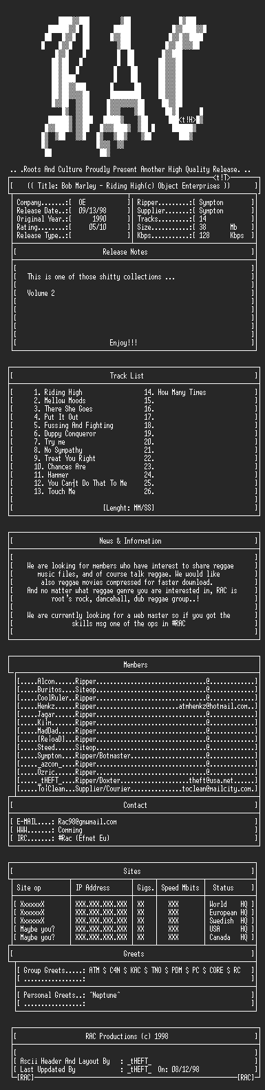 Formed in 1998 and specialised in reggae music. Renamed themselves RAC99 in 1999, switching back to just RAC at the end of the year. The group remains active to this day.